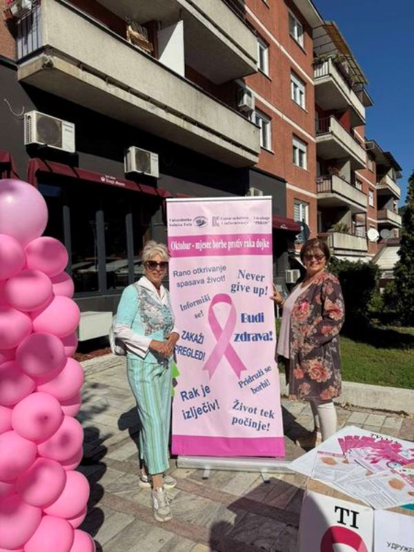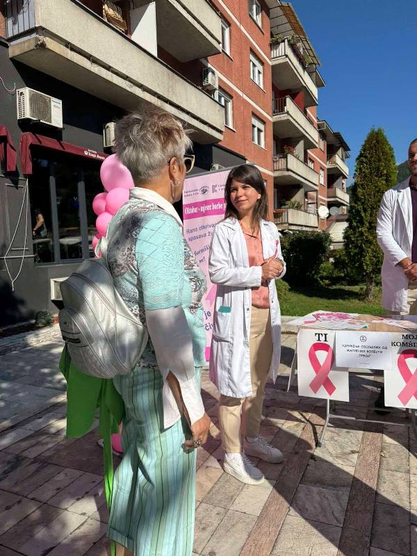 Foča, 15. oktobar 2024. Udruzenje PRKOS iz Foce sa studentima zavrsne godine medicine, na Trgu delilo je brosure i podstaklo na preventivne preglede kako bi ocuvali nase zdravlje. Snezana S.Milojevic -Udr. ILCO Srbije i Branka Kresic – ,,PRKOS,, Foca